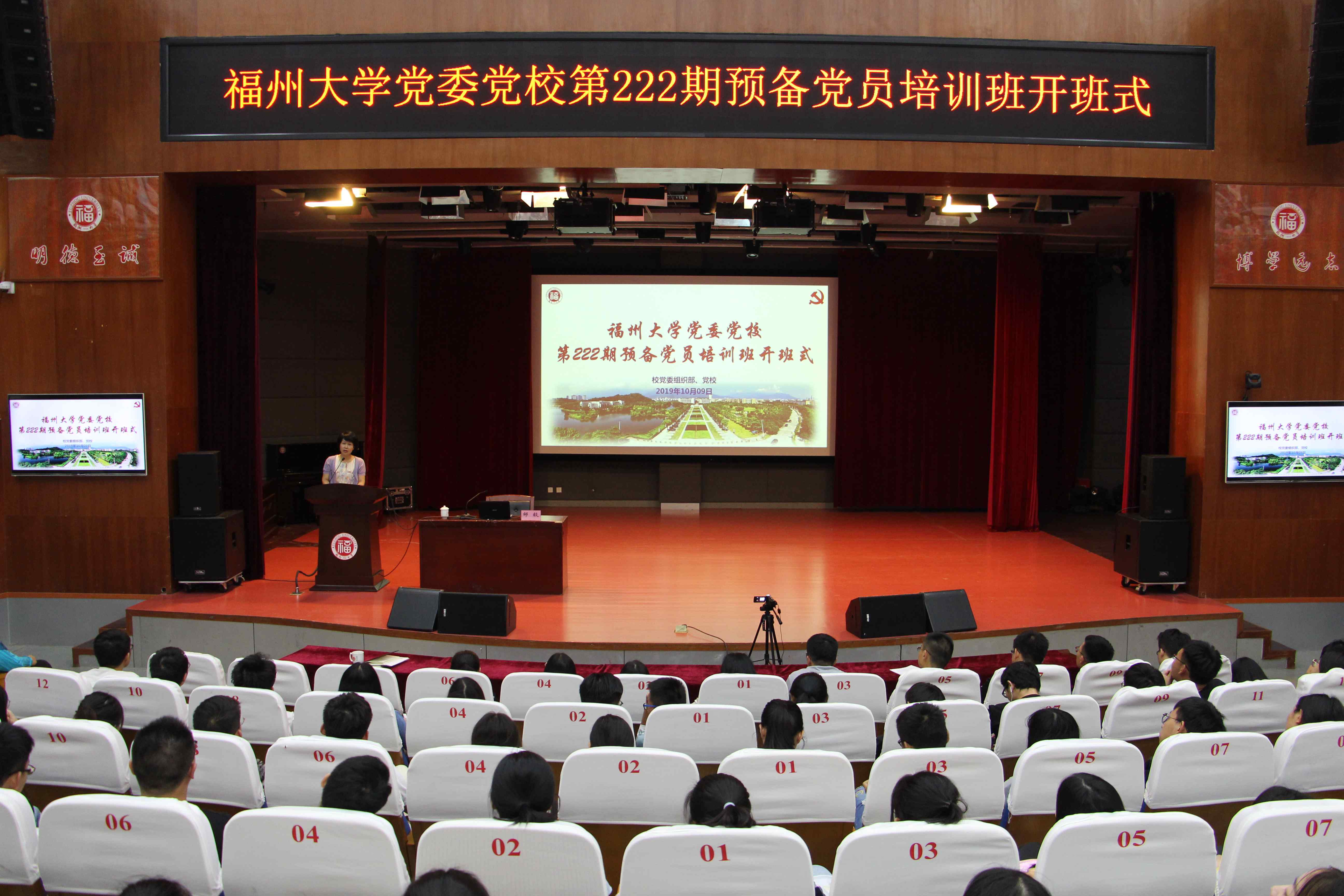 10月9日晚,福州大学党委党校第222期预备党员培训班在图书馆博学厅顺利开班。校党委常委、纪委邹毅书记为学员们作开班首讲,讲授了题为《以十九大精神为指导 深入推进党风廉政建设和反腐败斗争》的专题党课。党校第222期预备党员培训班825名学员聆听了本次专题党课。