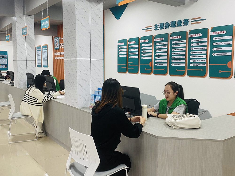 目前中心已有学工部、保卫部、团委、教务处、财务处、后勤管理处等10余个部门入驻,面向全校学生提供医保、学业帮扶、交通、教务、后勤物业等56项线上线下相关业务,学生可在此咨询就业政策、获取法律援助、预约学业导师,做到将相关业务办理流程简化为学生社区“一站式”办结,让同学们“少跑路”,达到“小事不小,马上办好”的效果。